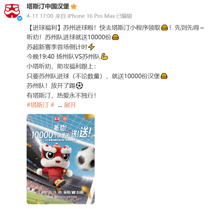 正式开赛,塔斯汀化身成球场外苏州队的拉拉队,还提供“进球福利”,限量汉堡送,庆祝苏州队赢球。