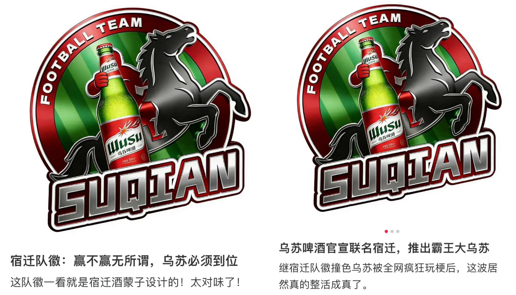 还有宿迁队徽与“大乌苏”啤酒标志的撞脸,堪称本届苏超最魔性的巧合,网友直呼太对味了,直接能脑补出“喝宿迁啤酒,吃苏州汉堡”的场景。