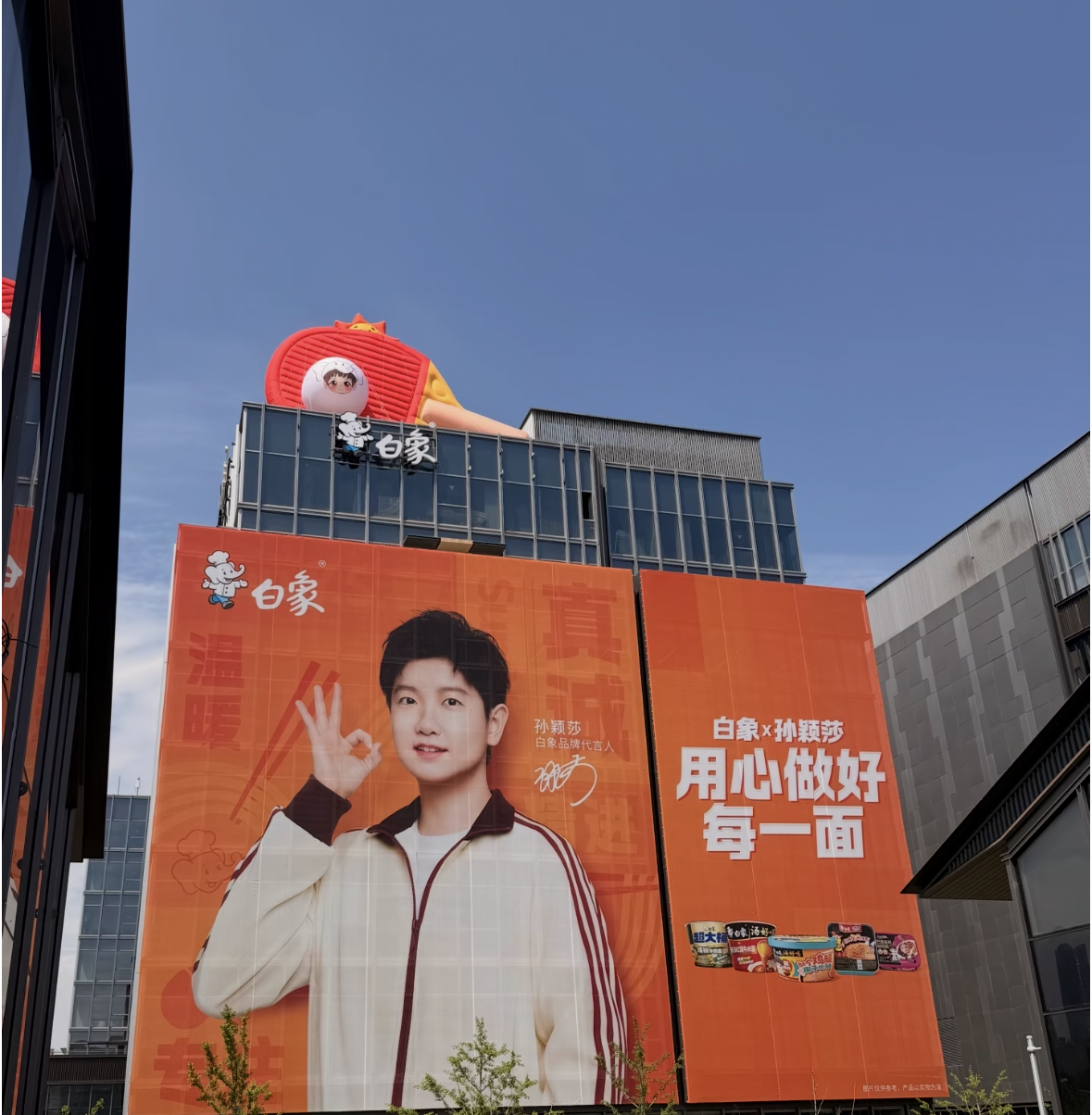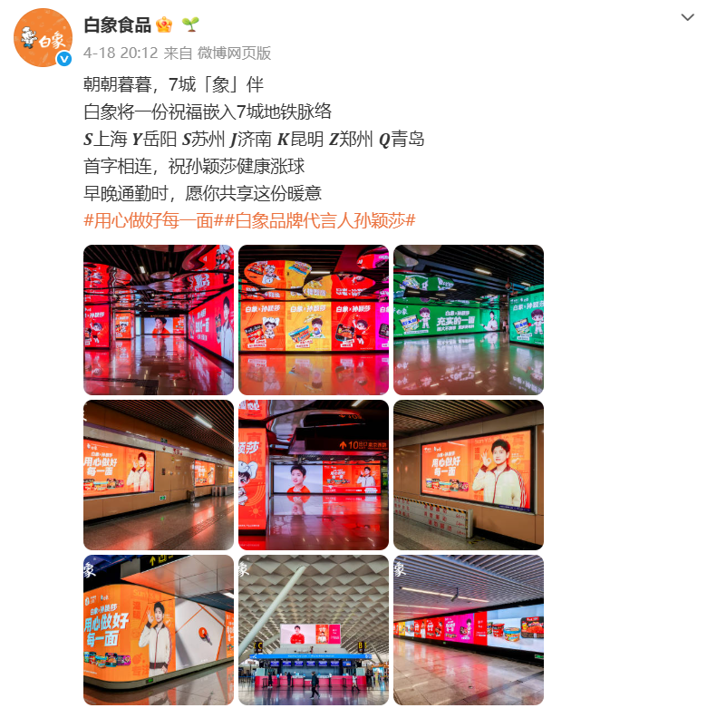 在线下广告的投放上,白象更是和粉丝来了一波隔空互动。总部大楼上,巨大的球拍和Q版莎莎格外醒目,大楼楼体海报也放上了巨幅孙颖莎官宣画面;而在上海、岳阳、苏州、济南、昆明、郑州、青岛七城的地铁大屏上,城市首字母连起来——S Y S J K Z Q,恰好拼成了那句熟悉的祝福:“孙颖莎健康涨球”。