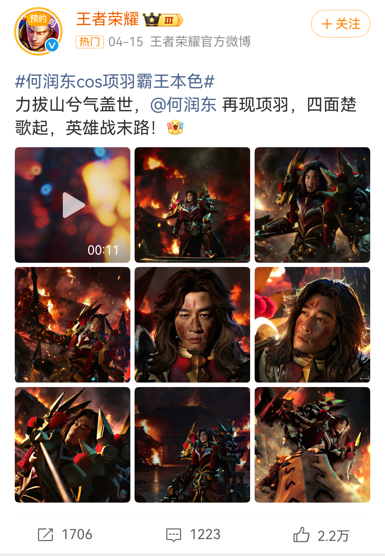 《王者荣耀》也是没有错过这波热度,直接邀请何润东cos项羽的原皮,宽肩厚背、眼神凛冽,自带“力拔山兮气盖世”的压迫感,妆造等细节更是拉满。