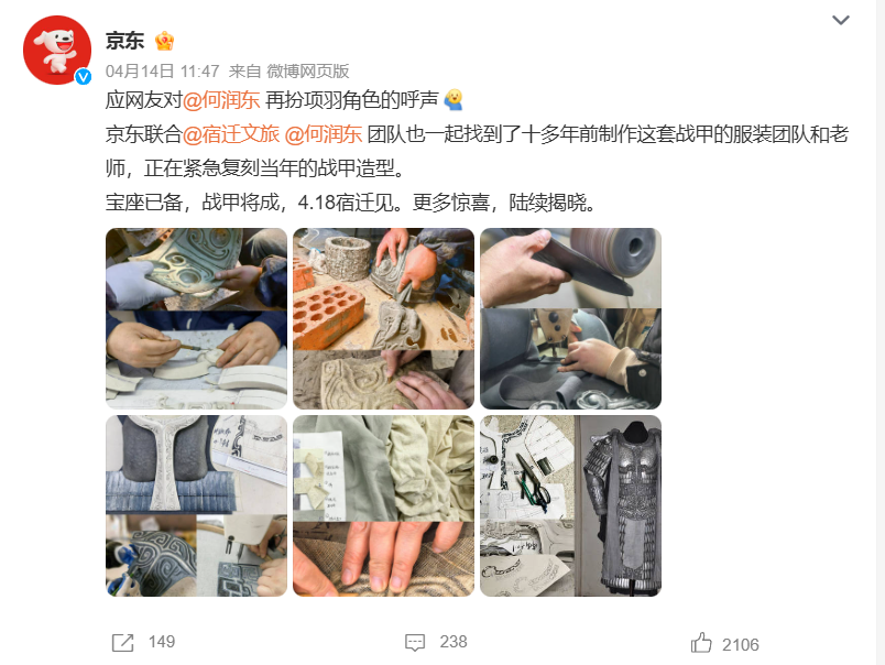 为了让何润东的项羽扮相更加还原,京东还联合@宿迁文旅、@何润东团队,一起找到了十多年前制作这套战甲的服装团队和老师。