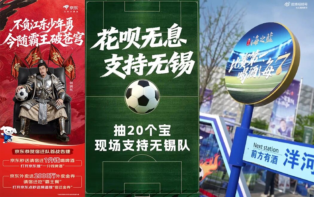 从文旅部门凭票免景区门票的“宠粉”操作,到宿迁队连夜摇人请何润东的“硬核应援”,再到支付宝因输球连夜改名的“卑微求生”,看似荒诞却又无比真实的互动,打破了体育赛事赞助商高高在上的疏离感。在苏超,品牌是能和球迷玩在一起、自黑互动的“显眼包”,也在潜移默化中将商业营销转化成了全民参与的情绪价值。