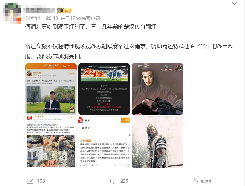 第二届苏超开幕,文旅率先出圈。揭幕战球迷们的热情被点燃,“跟着苏超游玩”的模式在网络上发酵,比如,常州揭幕战当天,全市公交地铁免费,提供部分停车位开放,迎接八方游客;盐城与连云港,相互为对方市民免费开放5A级景区。在第二场比赛中,宿迁队更是听劝,请来了项羽的扮演者何润东开场,成为了网络热点,上大分。