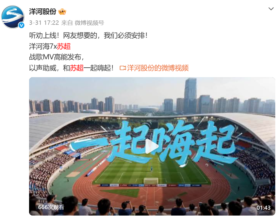 同时,苏超还吸引了海澜之家、洋河股份等大品牌入局,这些本地的龙头企业看中的不仅是赛场内的广告位,更是“一城一队”赛制下,品牌与城市荣誉绑定的连接力,实现与大众的情感共振。