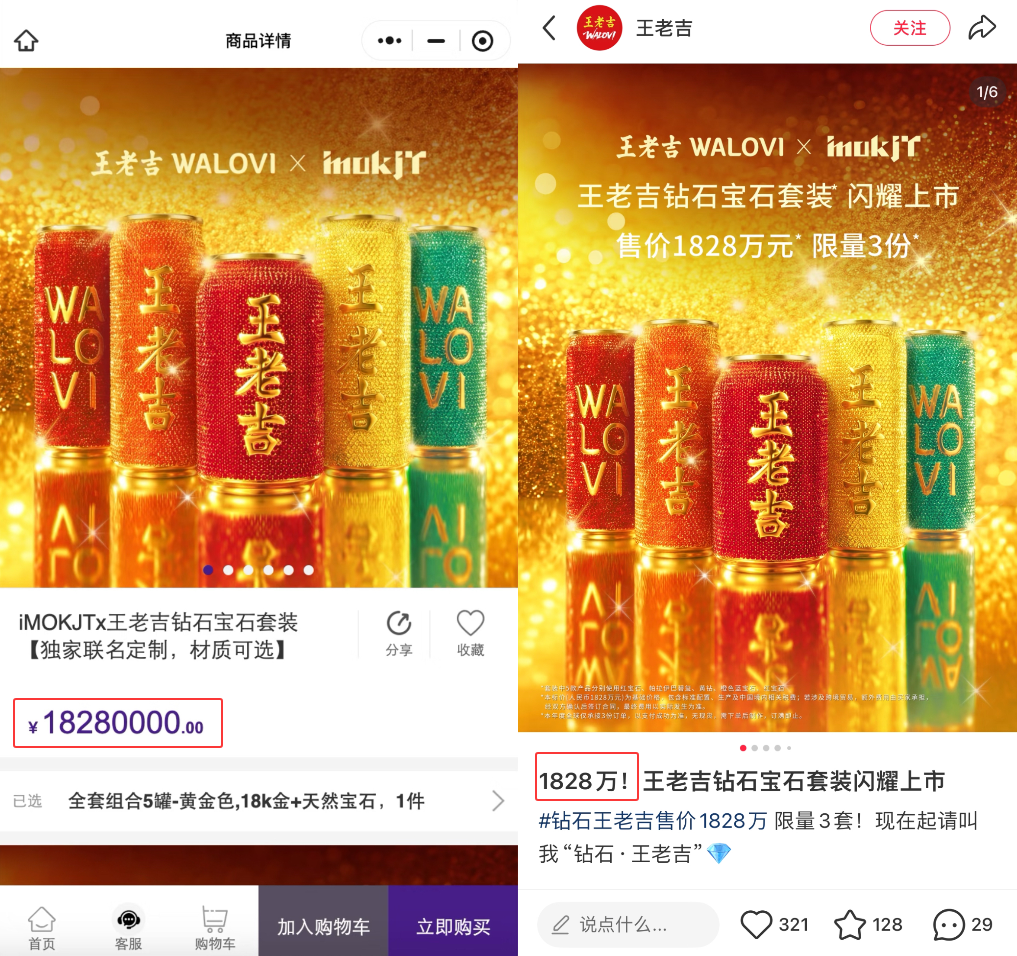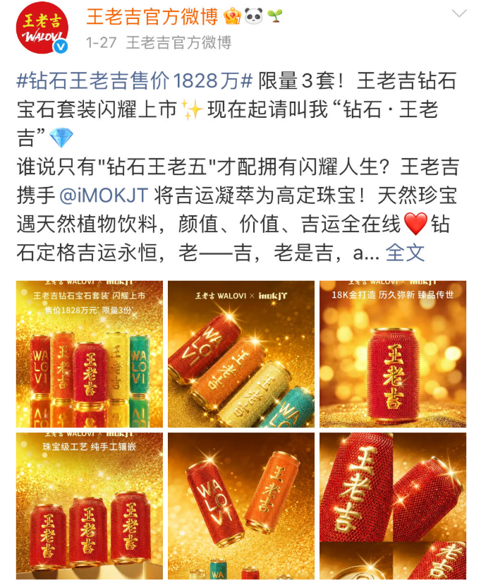 在大众的印象中,王老吉是一个平价且大众化的产品,如果没有联名,直接推出1828万臻藏版的产品,这种视觉冲击可能从惊喜直接变成视觉惊吓,让消费者充满疑问。有了联名伙伴的iMOKJT的加入,王老吉就能借助其固有产品特质,迅速在受众群体中建立起奢侈、高级的认知,让营销行为具有了“话题性”和“合理性”。