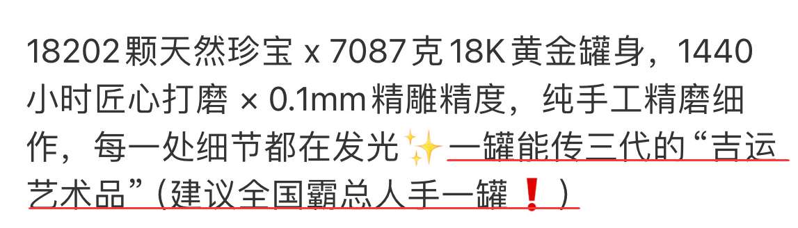 真的是每一个细节都在发光,这也契合了品牌的营销宣传语:“一罐能传三代的‘吉运艺术品’(建议全国霸总人手一罐)”。